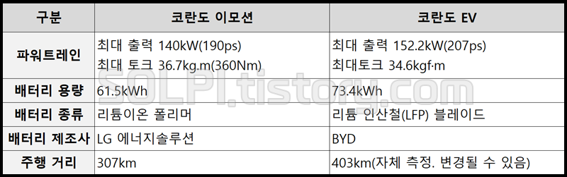 보시면 아시겠지만 코란도 이모션 시절보다 거의 모든 면에서 나은 수치를 보여줍니다. 국산이 아닌 중국산 BYD 배터리를 쓰는 건 아쉬운 일이긴 합니다만.
