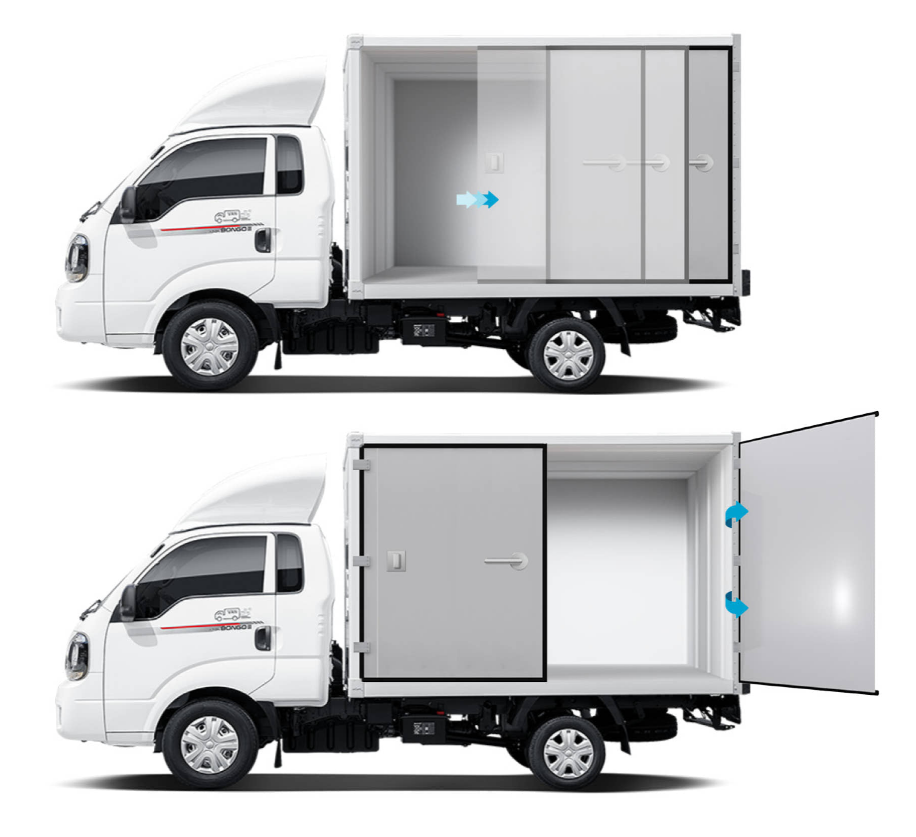 그런데 이번에 현대자동차와 기아가 적재함의 측면 도어를 스윙(여닫이)과 슬라이딩(미닫이) 방식으로 모두 열 수 있는 새로운 기술을 개발했습니다. 단차 없는 스윙·슬라이딩 도어 기술은 사용자가 편리한 방식을 선택하여 물건을 싣고 내릴 수 있습니다.